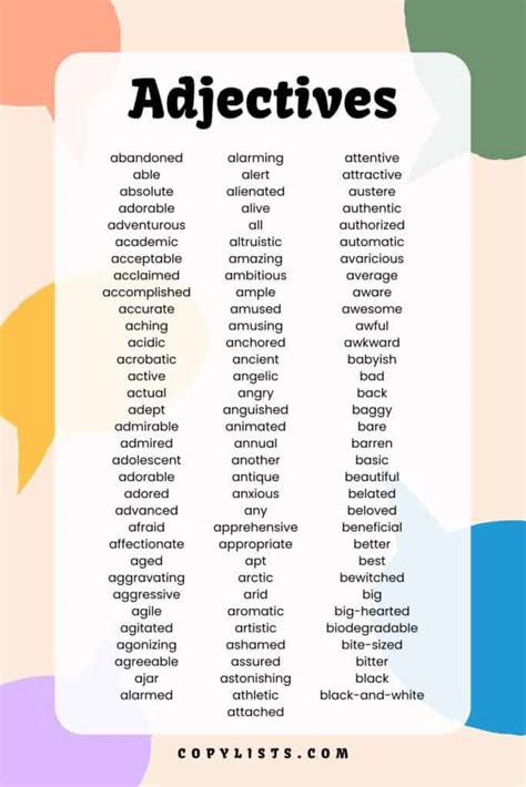Adjectives are seriously cool because they have the power to transform the ordinary into the extraordinary. They don’t just describe; they create impressions . Think about the difference between “a house” and “a sprawling , ancient , haunted house.” That second one immediately sparks your imagination, right? It tells a story before you even get to the main plot. Descriptive words , which are essentially adjectives doing their thing, help readers visualize, feel, and connect with what you’re saying. They can evoke a sense of wonder with words like magical , mysterious , or enchanting . They can convey a feeling of urgency with terms like critical , urgent , or immediate . Or they can simply paint a vivid picture of a scene, like a sun-drenched meadow or a stormy , turbulent sea. The more descriptive adjectives you use, the more engaging and memorable your content becomes. They are fundamental tools for writers, poets, and even everyday speakers to convey nuanced meanings and create specific moods or atmospheres. Imagine trying to describe a delicious meal without adjectives – it would be a tough challenge! You wouldn’t just say “food”; you’d say “a succulent , savory , mouth-watering dish.” Adjectives are the secret sauce that makes our language rich, expressive, and truly alive. They allow us to move beyond basic facts and delve into the subjective experience, sharing our perceptions and feelings with others in a powerful way. They are the building blocks of imagery and sensory detail, helping to bring abstract concepts to life and make concrete objects more tangible and relatable. So, next time you’re writing or speaking, don’t shy away from using adjectives – embrace their power to make your message resonate!