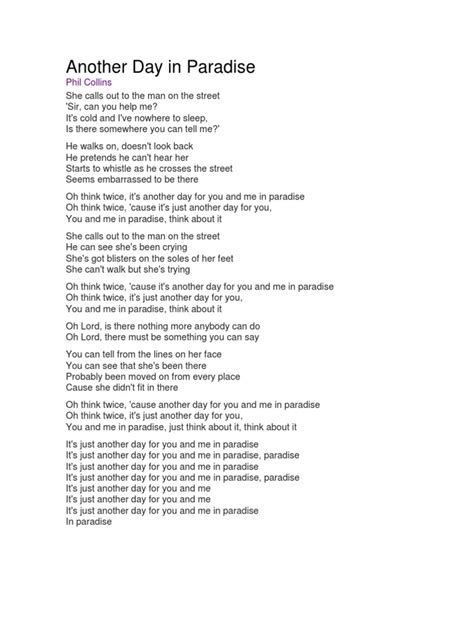 Finally, we reach the outro, which fades out with repetition: “Another day in paradise… Another day in paradise…” The repetition is key here. It’s not a joyous chant; it’s a somber, almost resigned sigh. It reinforces the central theme of the song – that the suffering and inequality we see are not fleeting moments but recurring, persistent aspects of our reality. It’s the mundane, the everyday experience for those on the fringes, and the ignored reality for those in the center. The phrase “another day in paradise” loses its positive connotation entirely. It becomes a label for a world where immense privilege exists alongside profound hardship, and where the former often goes hand-in-hand with indifference to the latter. The repetition makes it inescapable. We can’t just hear it once and forget it. It’s designed to linger, to echo in our minds long after the music stops. It’s a constant reminder of the disconnect between the idealized notion of paradise and the harsh truths of our world. It forces us to confront the fact that for many, the “paradise” they hear about or see is inaccessible, a distant dream, or worse, a source of pain when contrasted with their own struggles. Phil Collins uses this outro not to offer a solution, but to leave us with the weight of the problem . He wants us to sit with the discomfort, to internalize the irony, and to question our own role in perpetuating this divided reality. It’s a masterful way to end a song that doesn’t shy away from difficult conversations. The lingering question is: what are we going to do about it? Are we going to accept this “paradise” as it is, or are we going to strive for a world where the “songs of angry men” are silenced by genuine peace and opportunity for all? The lyrics of “Another Day in Paradise” continue to resonate because they tap into a timeless human struggle for empathy, justice, and a truly equitable world. It’s a song that demands our attention and encourages us to look beyond our own comfortable existence.