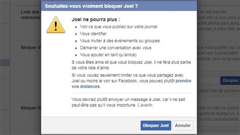 - Une fenêtre de confirmation va s’ouvrir. Facebook vous expliquera ce que le blocage implique (la personne ne pourra plus vous voir, vous envoyer de messages, etc.). Lisez attentivement.