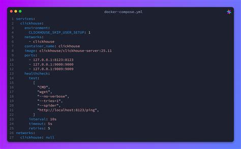 • healthcheck : Defines a health check to ensure the ClickHouse server is running correctly.