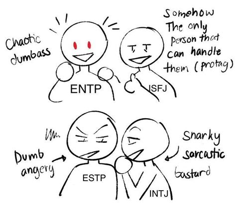 Before we jump into the shipping, let’s break down the personalities. The ENTP , known for their quick wit, love of debate, and innovative ideas, thrives on intellectual stimulation and challenging the status quo. Think of them as the life of the party, always ready with a new perspective or a devil’s advocate argument. They are naturally curious and enjoy exploring different ideas and possibilities. Their primary function is Extraverted Intuition (Ne), which means they are constantly generating new ideas and possibilities, and their secondary function is Introverted Thinking (Ti), which allows them to analyze and logically dissect those ideas.