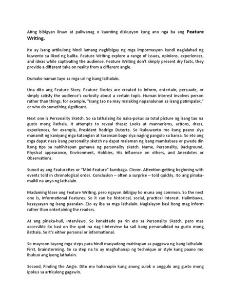 Maraming paraan para makagawa ng isang magandang feature article sa wikang Tagalog. Ang isang mahusay na feature article ay hindi lamang nagbibigay impormasyon, kundi nagbibigay din ito ng personal na ugnayan sa mambabasa. Ito ay parang isang kwento na may puso at kaluluwa, na naglalayong makuha ang atensyon at damdamin ng mga tao. Kapag nagsusulat ka sa Tagalog, mayroon kang malaking kalamangan dahil maaari mong gamitin ang yaman at ganda ng ating wika upang mas lalong mapalalim ang koneksyon sa iyong audience. Ang pagiging malikhain sa paggamit ng mga salita, idyoma, at mga ekspresyon na pang-araw-araw na ginagamit ng mga Pilipino ay susi para maging epektibo ang iyong akda. Tandaan, ang layunin ay hindi lamang ang pagpapahayag ng mga katotohanan, kundi ang paglikha ng isang karanasan para sa mambabasa. Kailangan nating isipin kung ano ang makakaantig sa kanilang puso at isipan, kung ano ang magpapaisip sa kanila, o kung ano ang magbibigay sa kanila ng bagong pananaw. Ang mga elementong ito ang naghihiwalay sa isang ordinaryong artikulo mula sa isang tunay na feature article na tumatatak sa alaala. Kaya naman, pagtuunan natin ng pansin ang bawat salita at bawat pangungusap upang masigurong ang bawat piraso ng ating sulatin ay may saysay at may dating.
