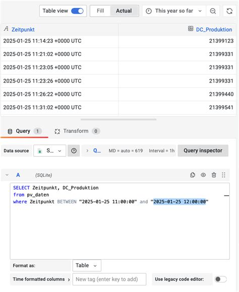 - Configure the Panel: In the panel editor, select your SQLite data source from the “Data source” dropdown. Then, write a SQL query to retrieve the data you want to visualize. For example, to display the temperature values over time, you could use the following query: