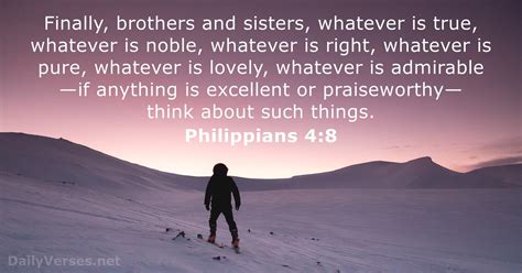 Hey guys! Today, we’re diving deep into one of the most uplifting and practical verses in the Bible: Philippians 4:8. This verse is like a mental checklist, guiding us on what to focus our thoughts on. Let’s break it down and see how we can apply it to our daily lives. Paul’s letter to the Philippians is full of encouragement, joy, and practical advice for Christian living. Chapter 4, verse 8 is particularly significant because it gives us a clear directive on how to manage our thoughts. Managing our thoughts is crucial because what we think directly influences our feelings, attitudes, and actions. This verse isn’t just a nice idea; it’s a powerful tool for maintaining mental and emotional well-being, rooted in biblical wisdom. By focusing on what is true, noble, right, pure, lovely, admirable, excellent, and praiseworthy, we can cultivate a positive and God-honoring mindset. This transforms not only our internal state but also our interactions with the world around us, fostering peace and joy in our lives. So, let’s explore this verse together and discover how we can make it a cornerstone of our daily lives.