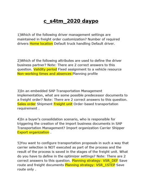 SAP exams are known for being challenging, and the TM certification is no exception. They often test not just your recall of features but your ability to apply them in realistic business scenarios. Expect questions that require you to analyze a given situation and choose the best course of action within SAP TM. For instance, you might get a scenario describing a complex shipment and be asked to select the optimal planning strategy or the correct way to handle a specific exception during execution. Understanding the different modules within SAP TM is crucial: Order Management , Planning , Execution , Basic Functions , and Integration are typically covered. Pay close attention to how these modules interact and how master data influences the processes. The questions are designed to reflect real-world usage, so think about how you’d actually use the system to solve problems. Don’t just memorize screen names; understand the ‘why’ behind each function. The SAP certification exam aims to validate your practical competence, not just your theoretical knowledge. So, when you study, always try to link the concepts back to practical application. It makes the learning more effective and better prepares you for the exam’s demands. You’ve got this!