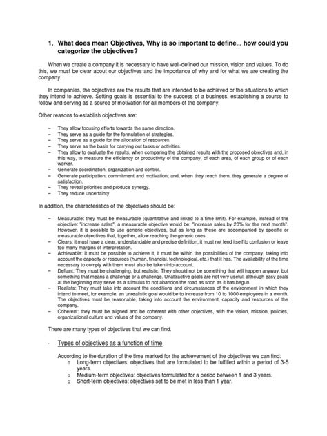 Beyond timeframe, objectives can also be classified by their scope or function . You might see strategic objectives , which are high-level goals that define the overall direction and purpose of an organization. These are usually set by top leadership and focus on the big picture, like ‘expanding into new international markets’ or ‘becoming the industry leader in sustainability.’ On the flip side, you have tactical objectives . These are more specific actions and targets designed to help achieve the strategic objectives. For example, if a strategic objective is market expansion, a tactical objective might be ‘develop a marketing campaign for the European market by Q3.’ Then there are operational objectives , which are the most detailed and relate to the day-to-day activities and performance of specific departments or teams. These could be things like ‘reduce customer service response time by 15% this month’ or ‘increase production output by 5% in the next shift.’ Understanding these different types helps you break down big ambitions into manageable chunks and ensures that all your efforts are aligned and working towards a common purpose. Pretty neat, huh?