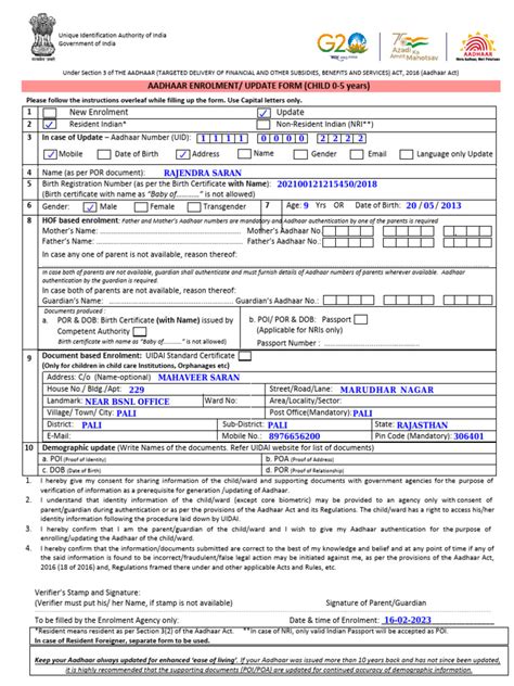 3. Visit the Enrolment Center: On the day of your appointment (or walk-in), carry all the necessary documents. For minors, you’ll typically need the child’s Aadhaar card (if available), birth certificate, and the Aadhaar card of the parent or guardian.